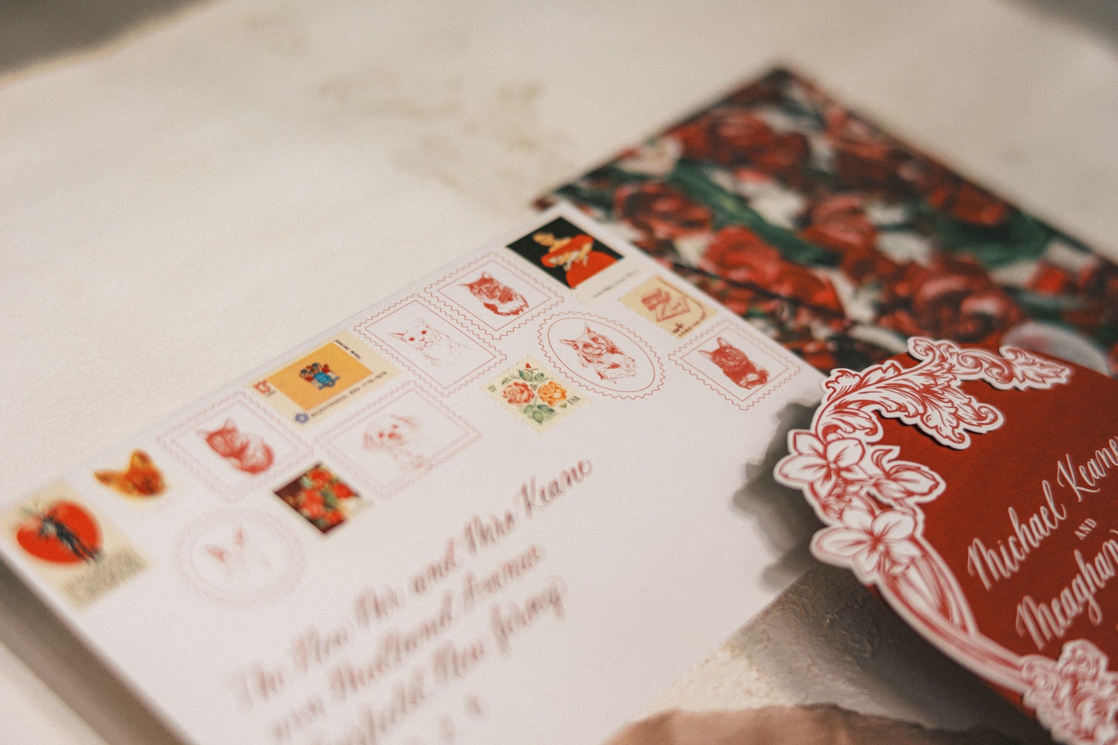 Meaghan & Michael are animal lovers with the fur-family to prove it – when we first talked they knew they wanted to include their six cats and one dog somehow in their stationery. Obviously, I said yes! Alli and I got to collaborate closely on this one, from a custom monogram to hand-painted signage. Not gonna lie, these are maybe my favorite envelopes ever (yes, I have said that before, but I really mean it this time). Incorporating their pet illustrations as “postage” along with a curated vintage postage set was one of my finer moments, and that paired with Alli’s beautiful burgundy calligraphy and an individually hand-painted rose on each and every envelope flap, they really can’t be beat. Check out the whole suite & more ways we included their pets!
