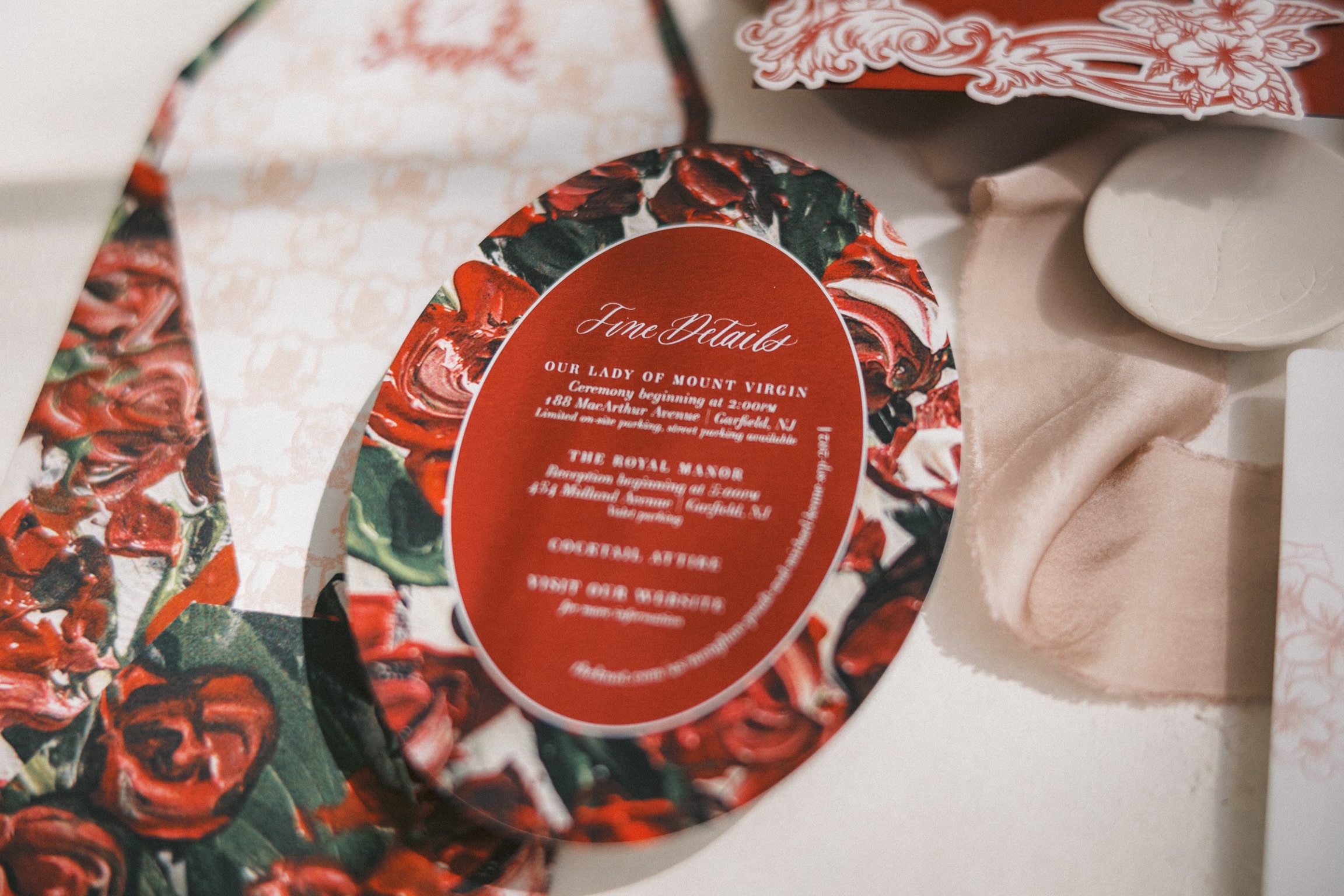 Main invitation: Double-thick oversized scarlet arch-cut card printed with white foil featuring digital spot calligraphy, with a custom die-cut cotton paper illustrated dimensional border piece
