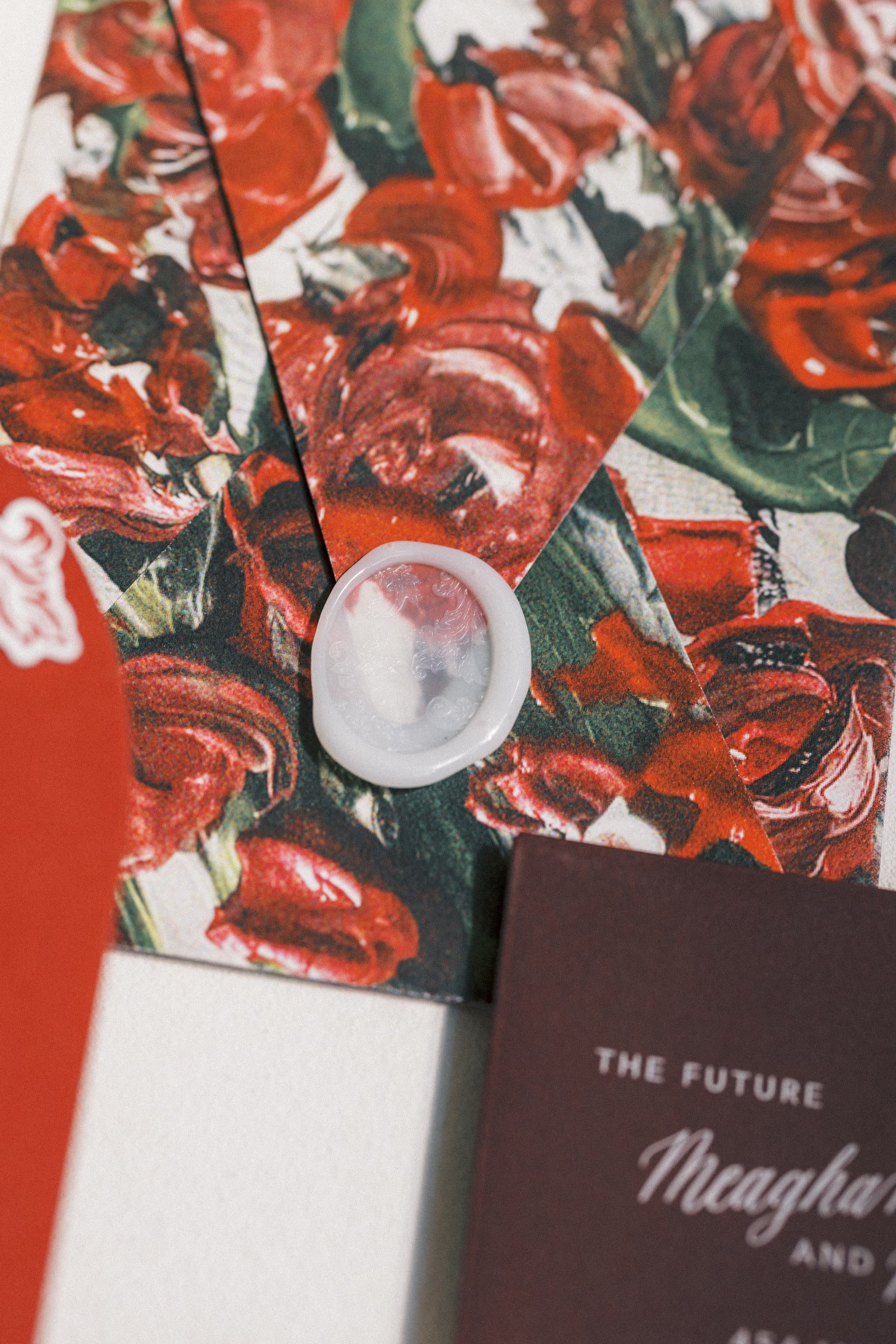 Inner envelope: custom inner flat printed on both sides with original floral painting, envelope liner letterpress printed with full pet portrait illustrated border and monogram, sealed with a vellum oval custom-design wax seal