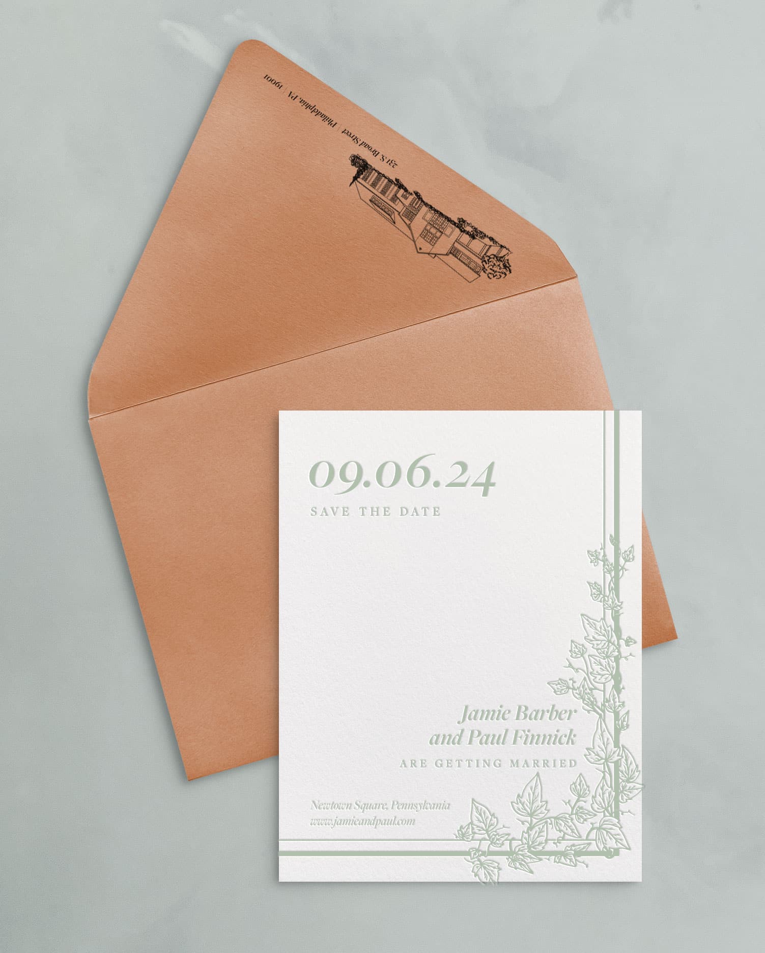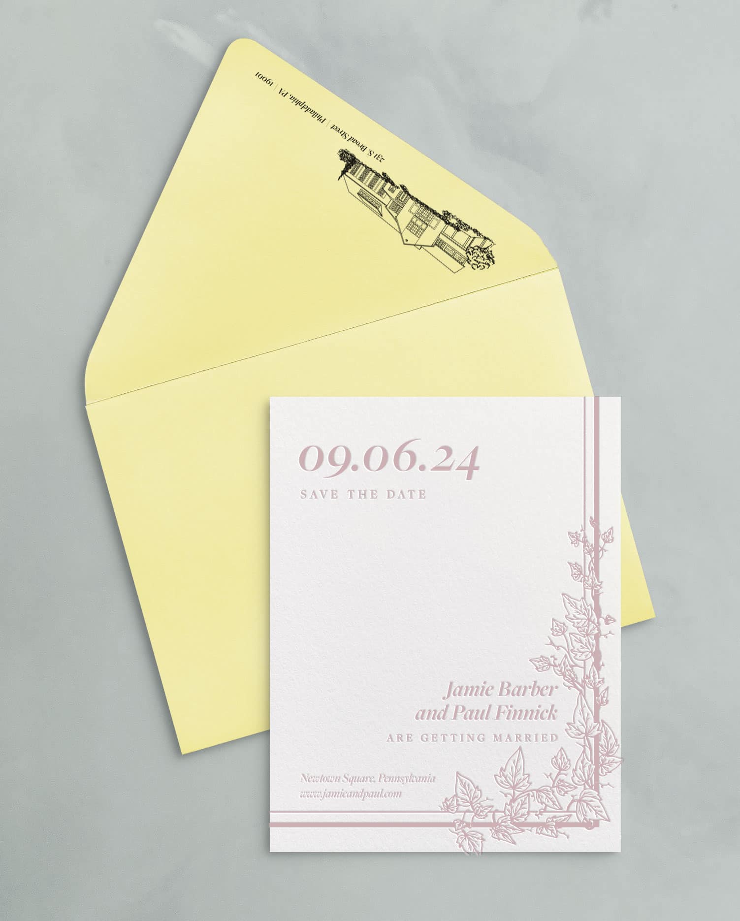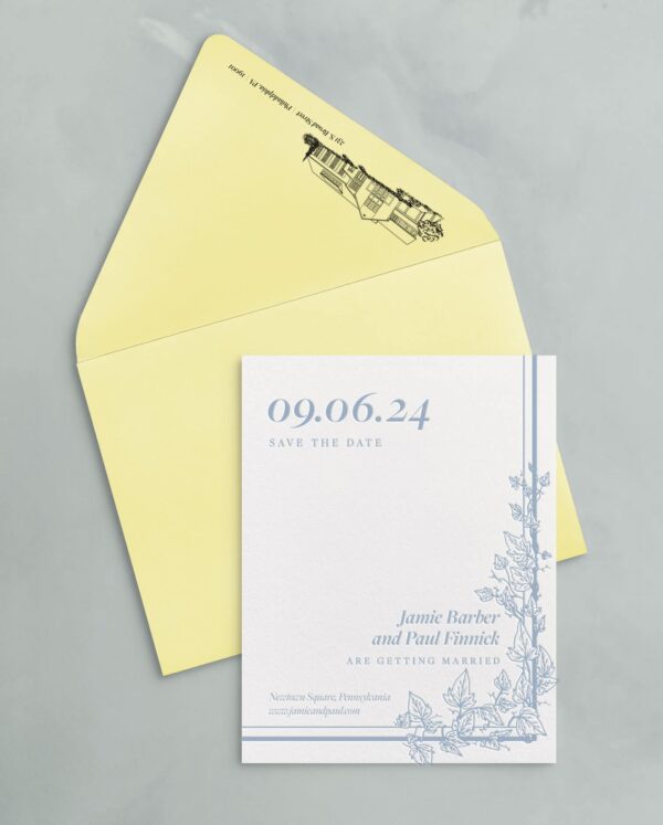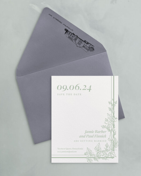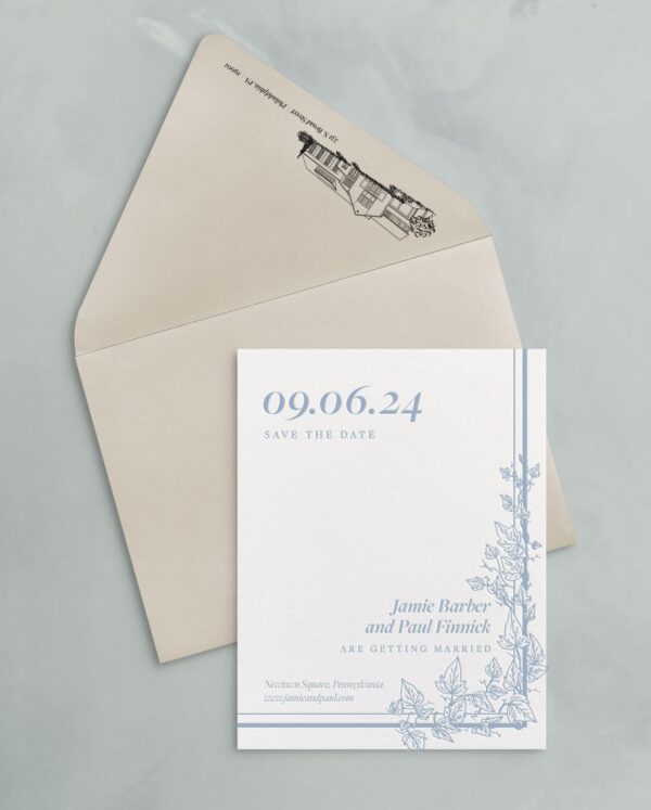 The save the dates include a 4.25×5.5″ main save the date card on cotton stock and an A2 outer envelope with flat-printed return address. Card is letterpress printed on a soft white paper.