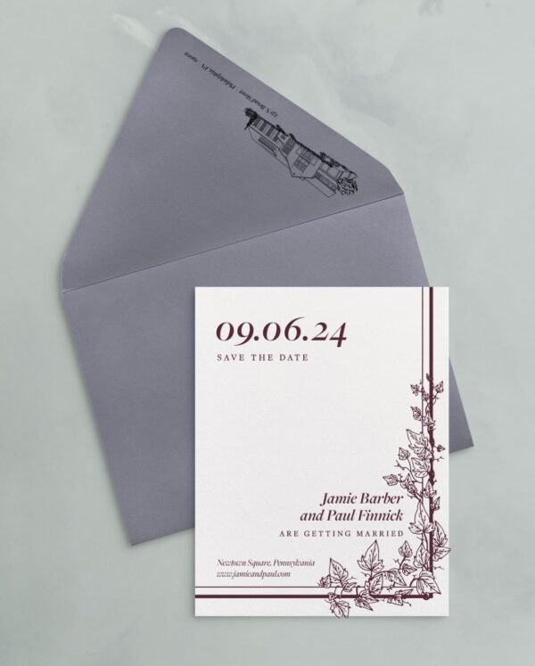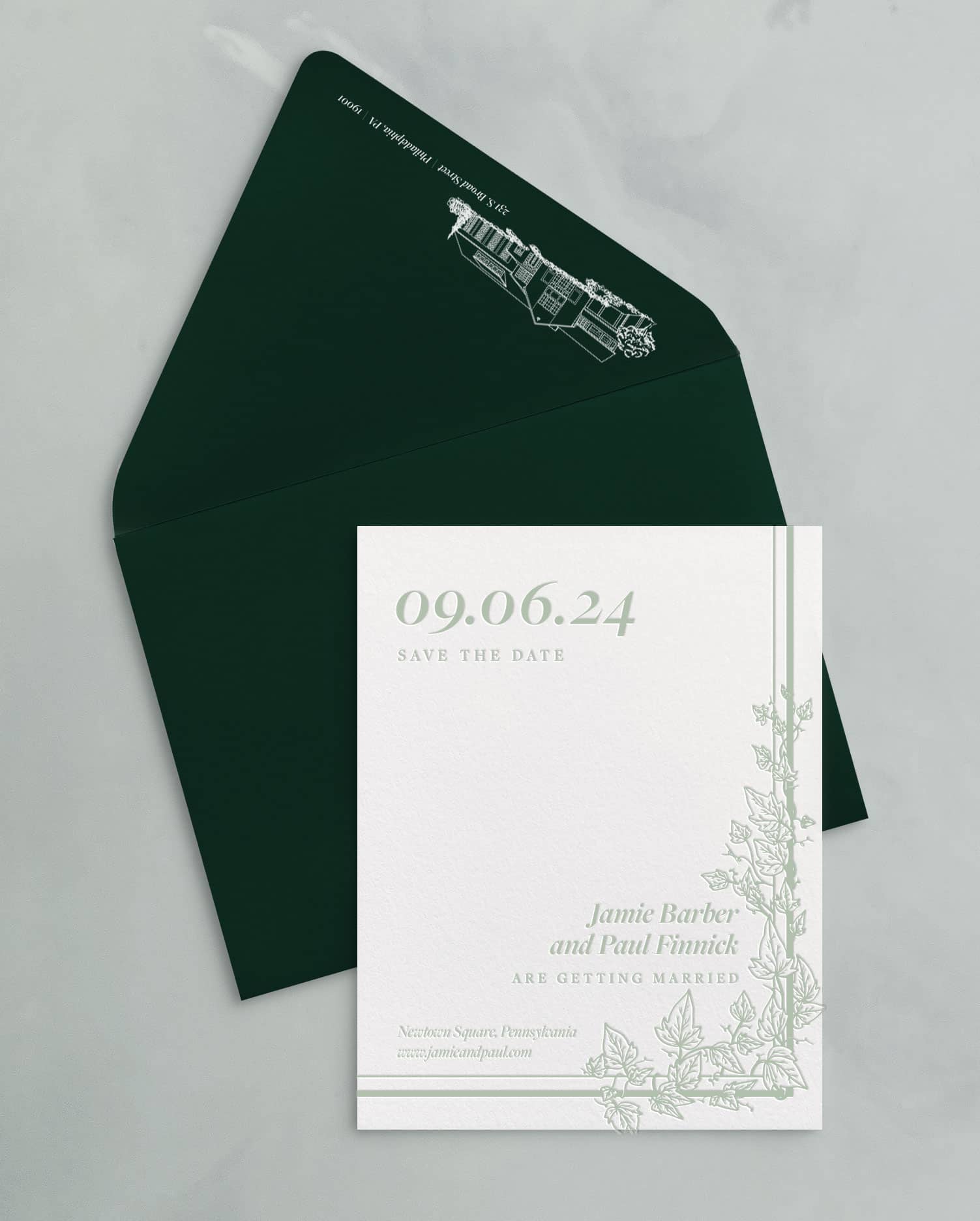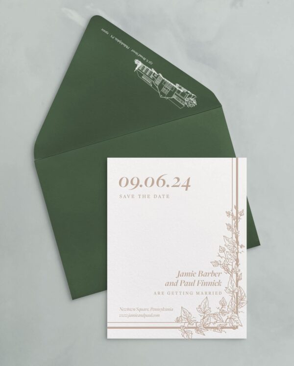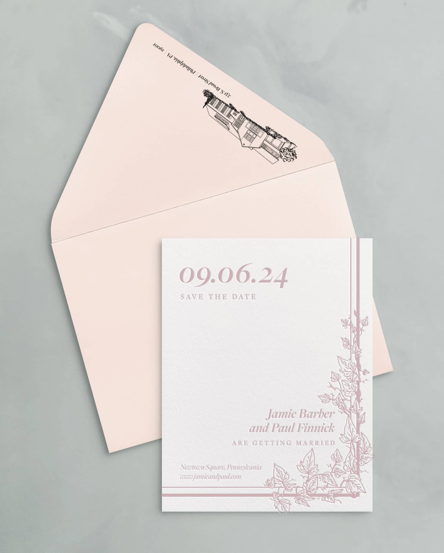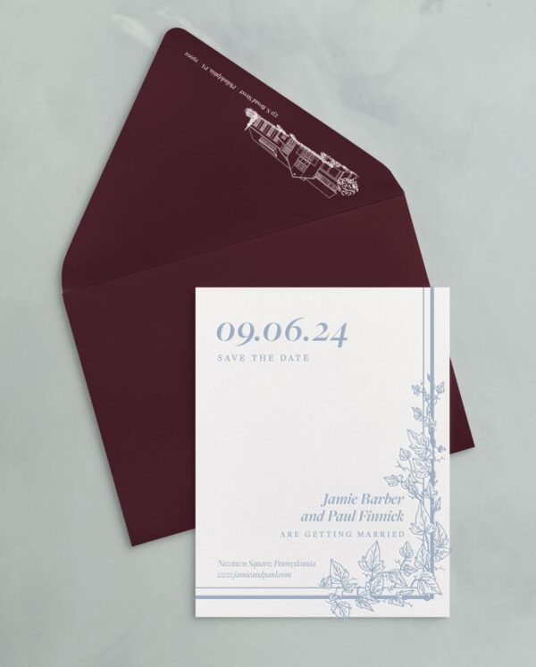 The save the dates include a 4.25×5.5″ main save the date card on cotton stock and an A2 outer envelope with flat-printed return address. Card is letterpress printed on a soft white paper.