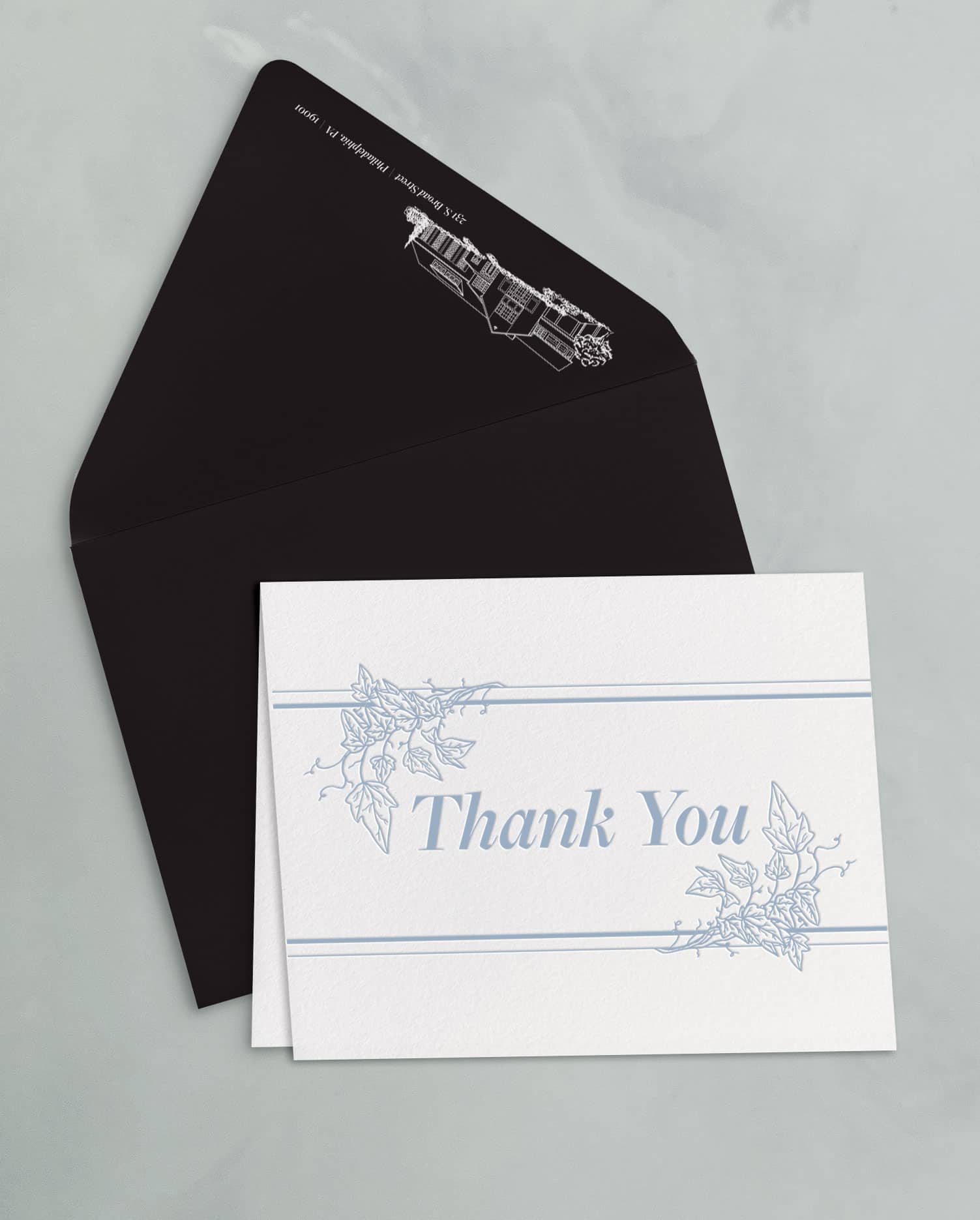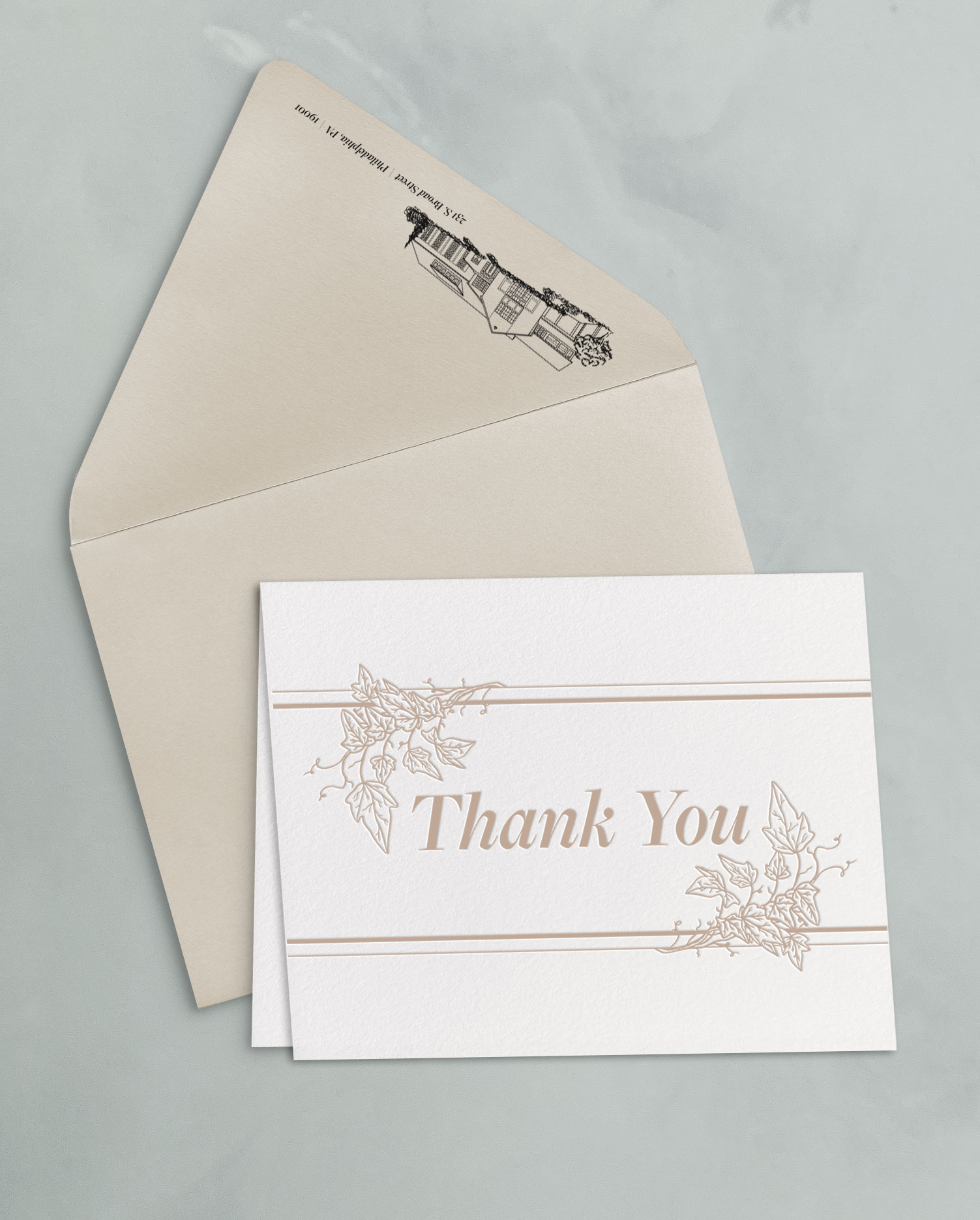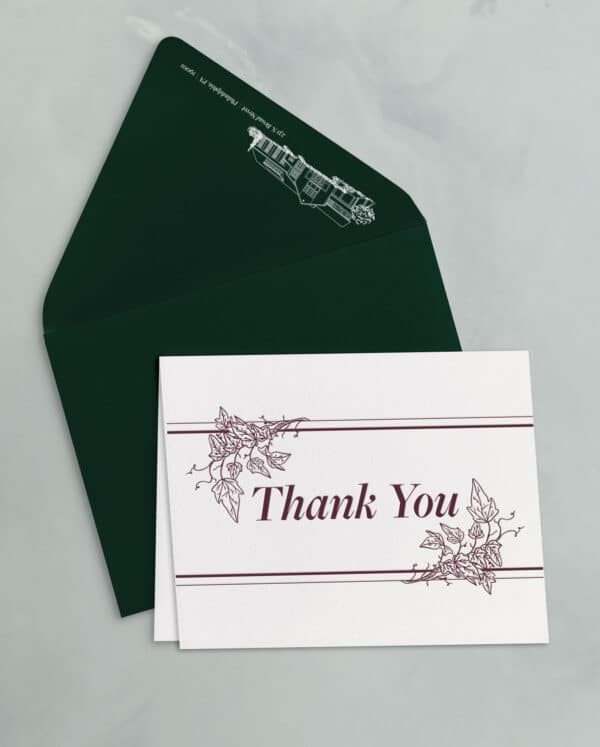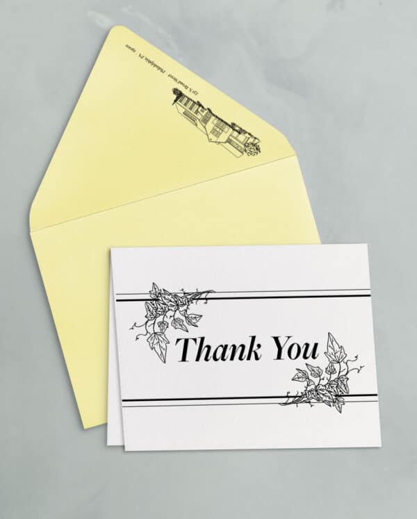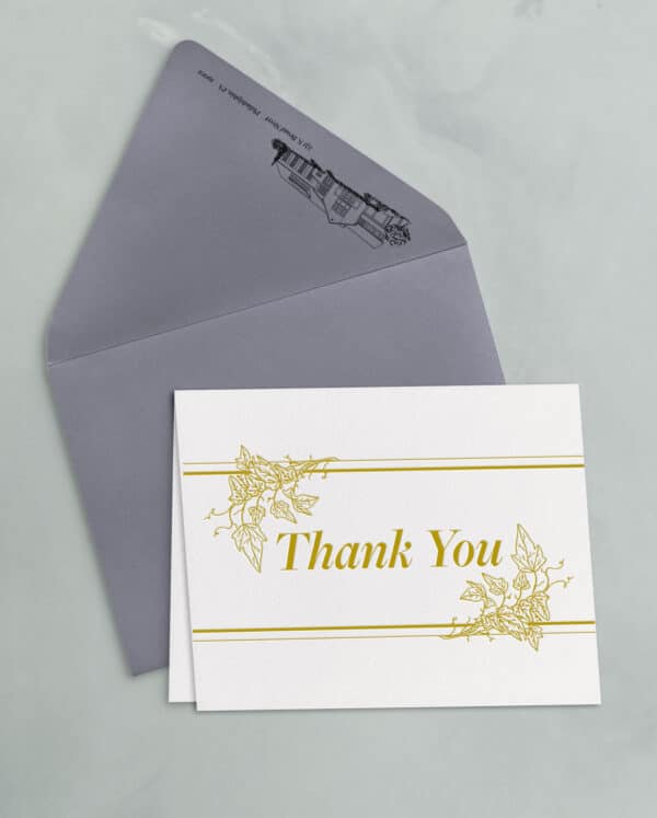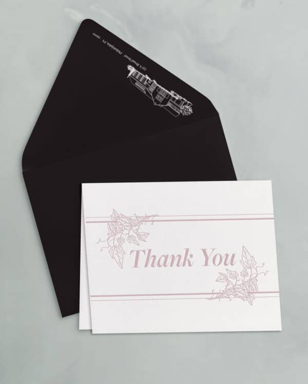 The thank you card sets include a 4.25×5.5″ folded card, letterpress printed on soft white cotton paper stock, and an A2 outer envelope with flat printed return address.