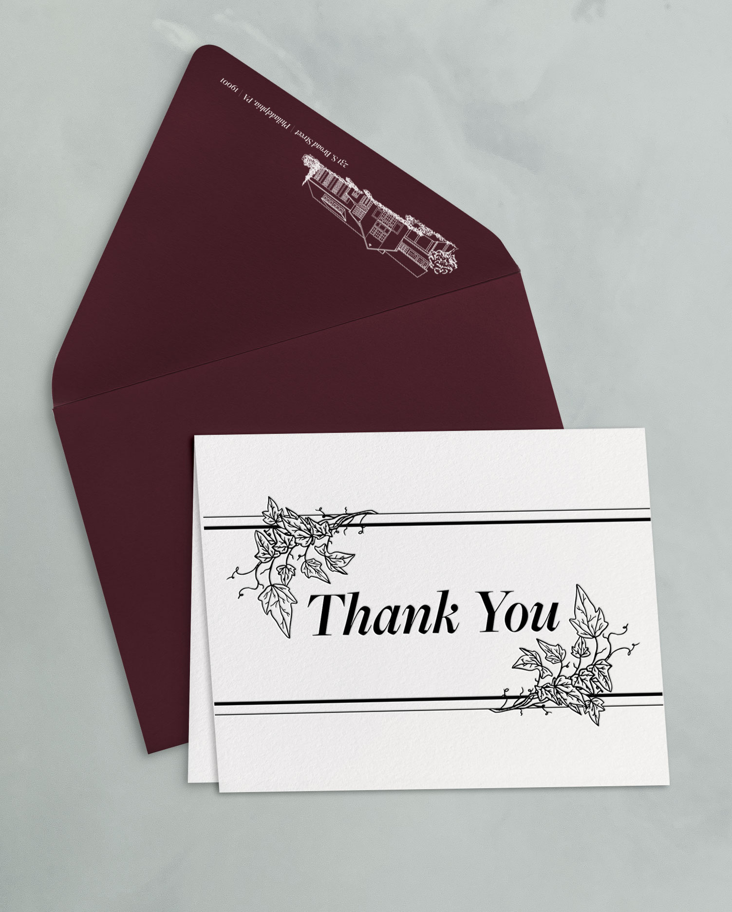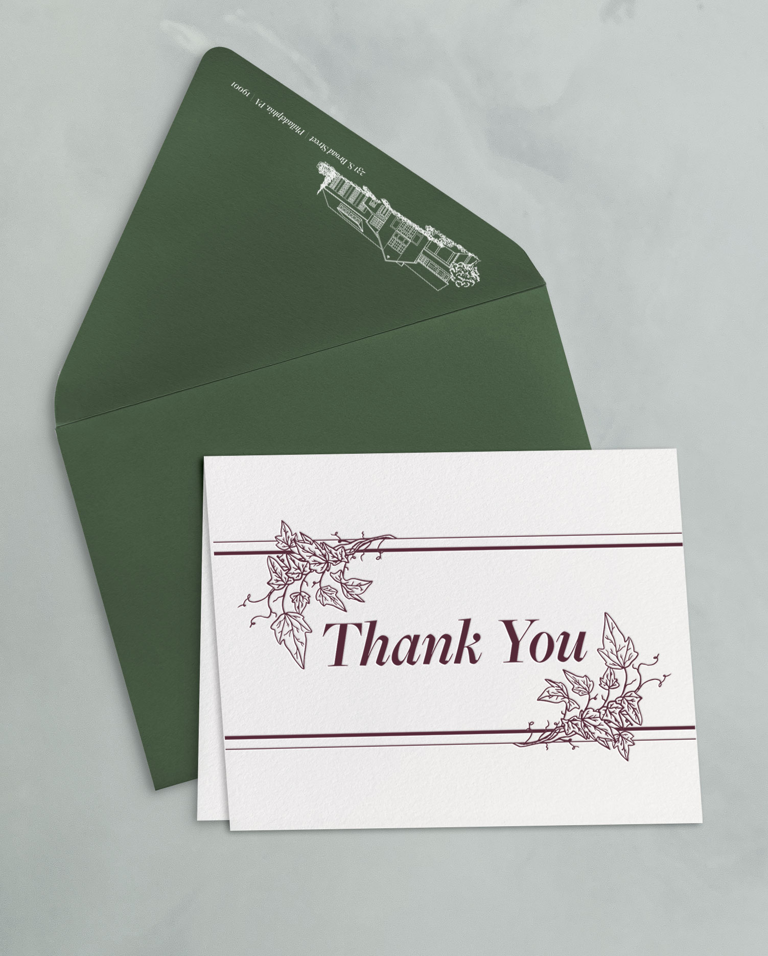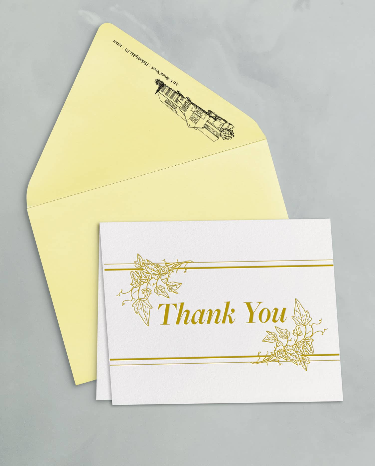 The thank you card sets include a 4.25×5.5″ folded card, letterpress printed on soft white cotton paper stock, and an A2 outer envelope with flat printed return address.