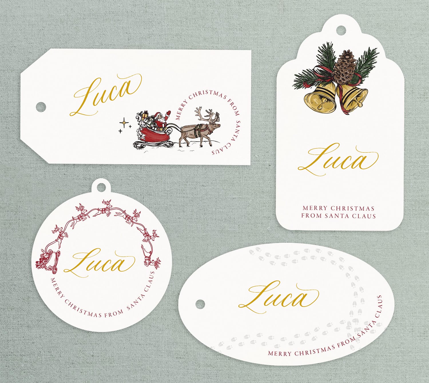 Each order will receive one red envelope, calligraphy addressed to the child(ren) with a North Pole post office wax seal and official North Pole Air Mail postage, including a snow-white envelope liner imprinted with reindeer hoof-prints. Inside will be one personalized letter written to all children (if more than one), and signed by Santa in gold calligraphy. Additionally, each child will receive their own official Nice List certificate, with their name, the year, and Santa’s sign-off in gold calligraphy (+$10 per additional child). Each certificate is embellished with a gold embossed Nice List seal of approval.